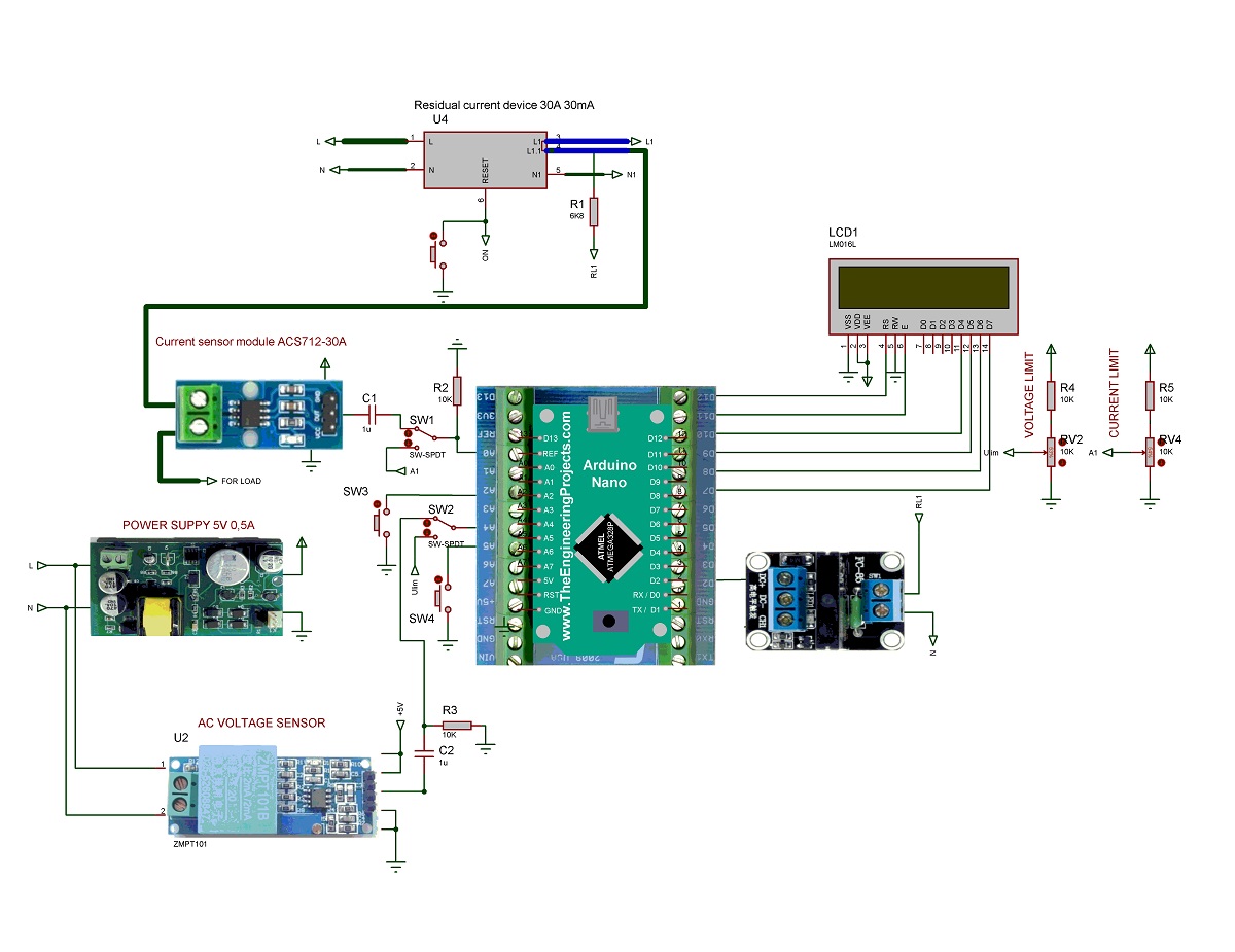 Устройство работает в цепи переменного тока. Отключает нагрузку при превышении тока предварительно установленного значения. Кроме того, измеряет переменное напряжение и отключает в случае, если оно превышает предварительно установленное значение. Схема собрана на базе Ардуино Нано. Установленные значения пределов максимального значения тока и напряжения записаны в энергонезависимую память Ардуино.