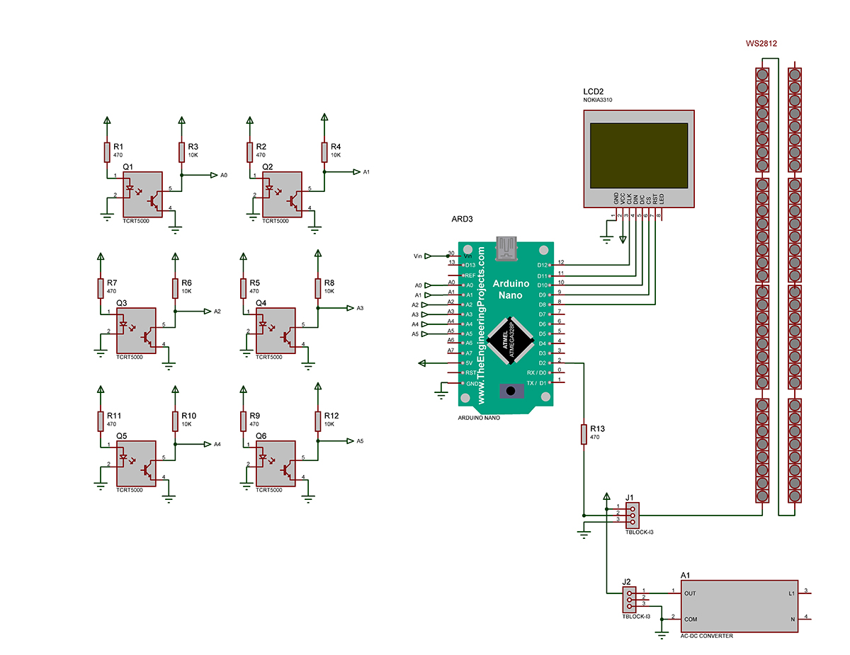В качестве сенсоров применены инфракрасные датчики отражения TCRT 5000. При кратковременном приближении руки к датчику Q1 освещение включается. Если удерживать руку более 1 сек. яркость будет увеличиваться. При кратковременном приближении руки к датчику Q2 освещение выключается. Если удерживать руку более 1 сек. яркость будет уменьшатсья. Если приближать руку к датчикам Q3 или Q4, будет изменяться цветовой оттенок зеленого, при приближении руки к датчикам Q5, Q6 изменяется цветовой оттенок синего. Информация о уровне яркости и о уровнях цветовых оттенков отображается на LCD дисплее NOKIA 5110. В качестве освещения применен светильник на 64-битной светодиодной ленте WS2812. Скетч для Ардуино выполнен в среде виртуального программирования для Ардуино FLPROG. Питание от AC-DC конвертера с выходом 5В 5А. Подробнее на видео.