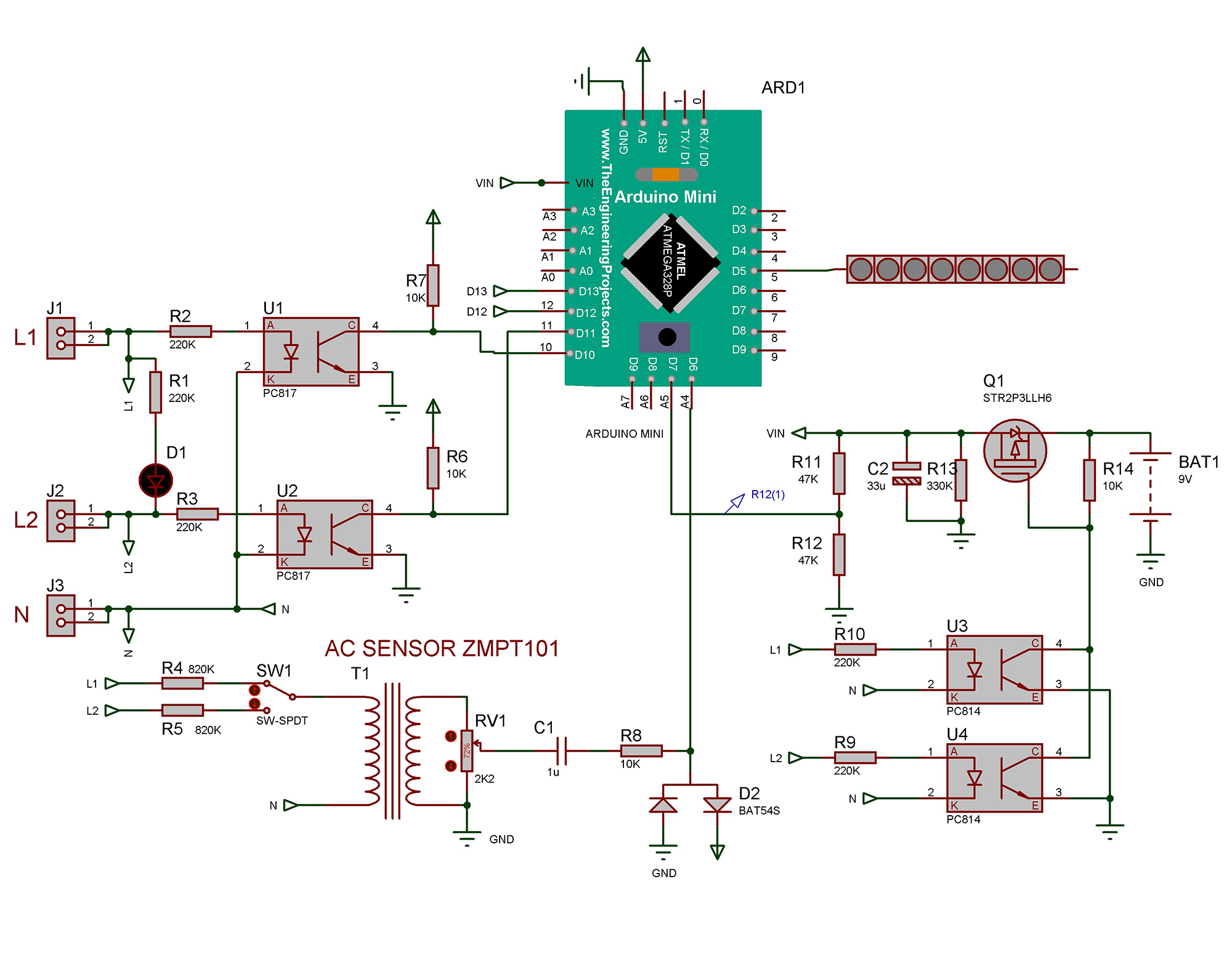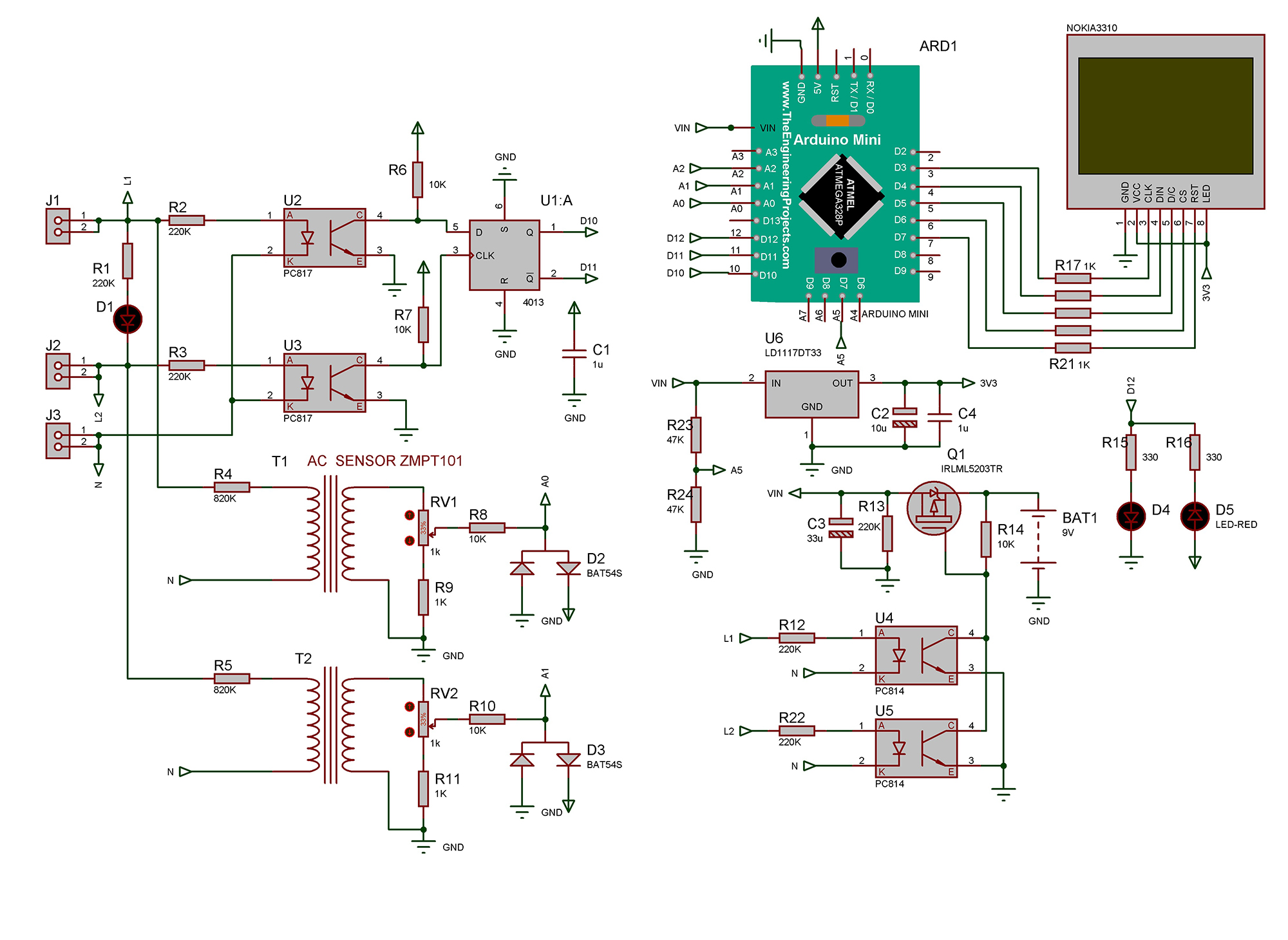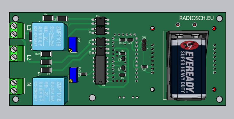 Для определения чередования фаз применяется D-триггер U1, входы D и CLK которого подключены к фазам через оптроны U2,U3 и резисторы R2,R3. Выходы U1 подключены к цифровым входам D10,D11 Ардуино. Для измерения фазных напряжений применяются трансформаторы Т1 и Т2. Выходы трансформатотов через цепи RV1,R8, и RV2,R10, подключены к аналоговым входам А0 и А1 Ардуино соответственно. Питание от аккумулятора 9В 6800мА/ч включается также автоматически.