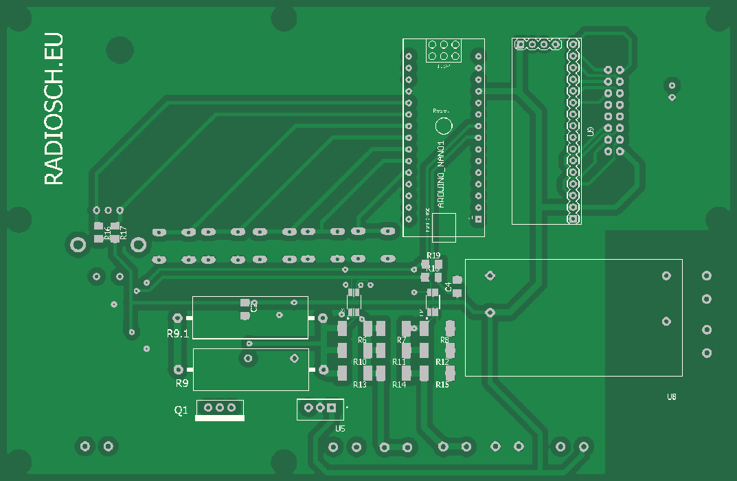 УЭлектронная нагрузка состоит из операционного усилителя U6, мощного транзистора Q1 и декадных резистивных делителей R6,R10,R13 R7,R11,R14 и R8,R12,R15. Установка тока нагрузки осуществляется с помощью энкодера EN1 и ЦАП U2, выходное напряжение которого поступает на + вход операционного усилителя U6. Значение тока от 1 до 10А считывается АЦП U1, подключенного к Ардуино по I2C. Значения токов от 100мА до 1А и от 1мА до 100мА считываются с помощью 16-ти разрядных АЦП U3,U4 также подключенных к Ардуино по I2C. Информация отображается на 2-х строчном 20-ти символьном LCD дисплее подключенном к Ардуино по I2C. Микросхема U7 формирует отрицательное напряжение питания операционного усилителя U6. Питание устройства от AC DC конвертера 5В 1А.