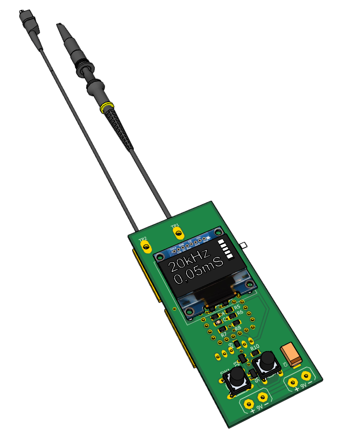 Пробник позволяет измерять частоту до 30мГц, постоянное напряжение до 12В и может работать в качестве генератора импульсов до 20кГц.