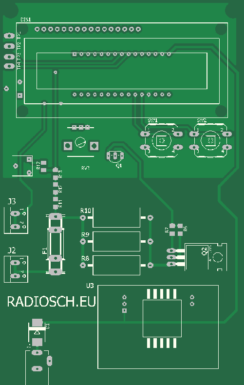 Регулировка тока производится кнопками SW1 SW2 путем изменения напряжения на выходе ЦАП U1 и операционного усилителя U2, которые управляют транзисторами Q1, Q2. Напряжение стабилизации измеряется с помощью делителя R11 - RV2 на аналоговом входе А0 Ардуино. Ток тестируемого стабилитрона или светодиода измеряется путем измерения падения напряжения на резисторе R14, усиленного операционным усилителем U4, выход которого подключен к аналоговому входу А1 Ардуино. Кроме того, предусмотрена защита испытуемого прибора от превышения тока. Установка максимального тока производится переменным резистором RV3. При превышении значения установленного напряжения во время установки тока рост тока прекращается. Индикация напряжения и токов осуществляется с помощью 2-х строчного 16-ти символьного LCD дисплея, подключенного к Ардуино через I2C. Скетч для Ардуино выполен в FLPROG