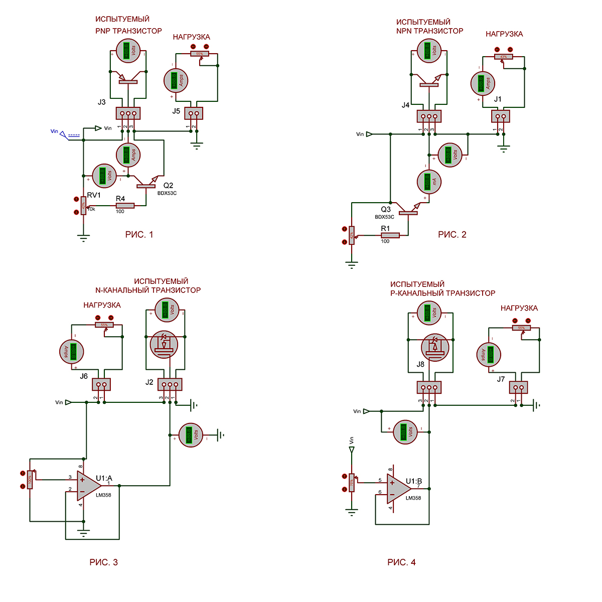 На рис.3 и 4 приведены схемы измерения параметров N-канального и Р-канального полевых транзистрорв. Здесь потенциометром изменяется напряжение на затворе и измеряется напряжение на затворе, напряжение сток-исток и ток стока испытуемого полевого транзистора.